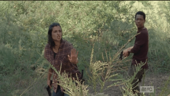 tara shushes Published March 11, 2015 at 589 × 332 in The Walking Dead, Season 5, Episode 12, “Remember” Tara whirls and shushes them, and Glenn rushes up to Nicholas, “Hey…hey! It’s gone, leave it!” But the Douchebag Duo refuses.”It took down one of our friends!” Aidan says. “It’s nearby…we’re not letting it go.”