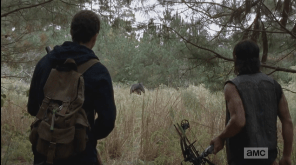 aaron and daryl approach the horse Published March 15, 2015 at 594 × 331 in The Walking Dead, Season 5, Episode 13, “Forget” Aaron says he has been trying to get the horse, named “Buttons” by a child in Alexandria, for months, to bring him inside the safety of the walls, but the horse would spook whenever Aaron or Eric would try to approach it.