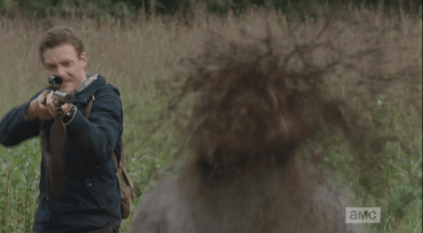 aaron blows walker head away Published March 16, 2015 at 594 × 327 in The Walking Dead, Season 5, Episode 13, “Forget” Aaron returns the favor by blowing another walker’s head away when it comes up on Daryl. Daryl thanks Aaron, and they turn to save Buttons, but, tragically, they are too late…