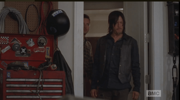 aaron brings daryl to the garage Published March 17, 2015 at 597 × 334 in The Walking Dead, Season 5, Episode 13, “Forget” In reply, Aaron brings Daryl to the garage, which is stocked with tools, a motorcycle frame, and many, many parts. Aaron explains that the frame and the tools were there already, that whoever lived here, before, must have built bikes.