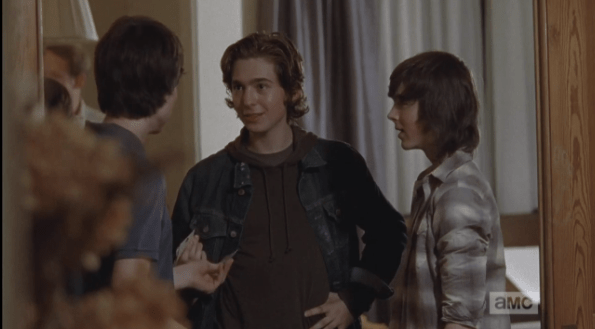 carl is talking to rowan and mikey like teens Published March 17, 2015 at 595 × 329 in The Walking Dead, Season 5, Episode 13, “Forget” Rick then sees Carl joking and laughing with Rowan and Mikey like real teenage boys are supposed to.