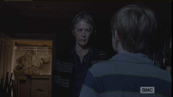 carol says to sam you can never tell anyone Published March 17, 2015 at 595 × 335 in The Walking Dead, Season 5, Episode 13, “Forget” Carol’s face loses its smile. “You can never tell anyone,” she says quietly.