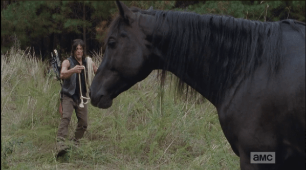daryl approaches buttons Published March 15, 2015 at 598 × 332 in The Walking Dead, Season 5, Episode 13, “Forget” Daryl begins to approach Buttons cautiously, talking softly to the horse.