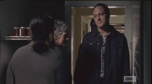 Just then, “Tobin” comes in, tells Olivia he and his workmate have to make a “withdrawl” from the gun lending library, as “the boss lady” wants them to check a segment of the wall before the party. Olivia invites Carol to take what she needs, and follows the men to the back of the storeroom, where the armory is.