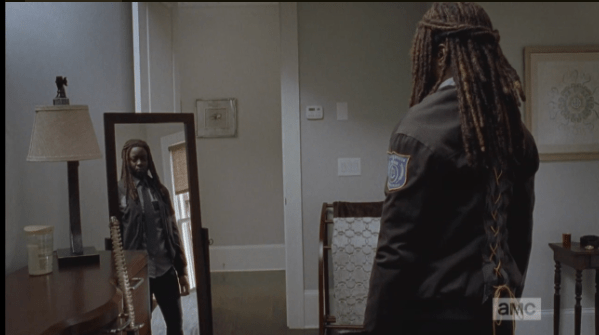 michonne models her new uniform Published March 14, 2015 at 599 × 335 in The Walking Dead, Season 5, Episode 13, “Forget” Meanwhile, Michonne models her new constable’s uniform in the mirror.