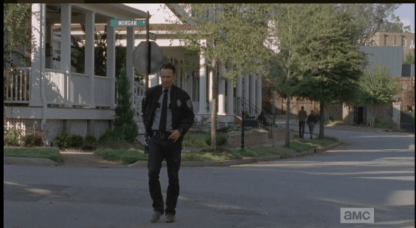 morgan street Published March 18, 2015 at 602 × 330 in The Walking Dead, Season 5, Episode 13, “Forget” We see Rick walking past “Morgan Street.” (I hope Daryl and Aaron find Morgan out there and recruit him!)
