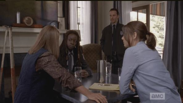 no, no and no Published March 15, 2015 at 592 × 332 in The Walking Dead, Season 5, Episode 13, “Forget” Maggie looks at Deanna. “No,” she answers. Deanna looks at Michonne. “No,” replies Michonne. Deanna finally looks up at Rick. “No,” he says, after a brief pause.
