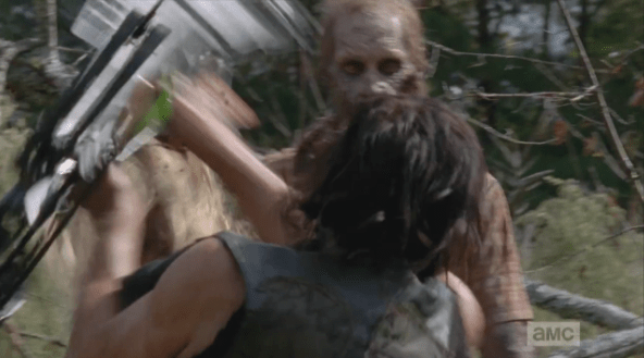 poor daryl employs his upside the head Published March 16, 2015 at 592 × 329 in The Walking Dead, Season 5, Episode 13, “Forget” Instead of enjoying a loving moment with a fellow equine survivor, Daryl must employ his invaluable “crossbow upside the walker’s head technique” as Buttons rears and gallops away.