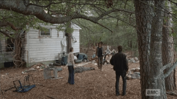 We see Rick, in his constable’s uniform, Carol, in her Junior League uniform, and Daryl in his Daryl Dixon uniform, vest and greasy hair. Brother has still not taken a shower yet…that’s some willpower. I would have taken like 25 showers by now, and brushed my teeth like 100 times.