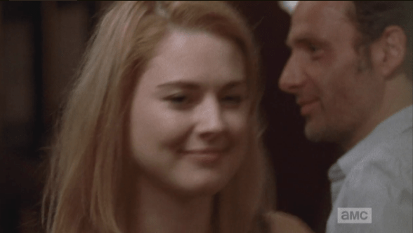 rick and jessie both smiling Published March 16, 2015 at 588 × 333 in The Walking Dead, Season 5, Episode 13, “Forget” Jessie does the proper thing, at that moment, and excuses herself, and as she walks away, they both have smiles on their faces.
