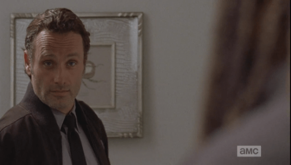 rick comes up on michonne Published March 14, 2015 at 592 × 335 in The Walking Dead, Season 5, Episode 13, “Forget” Rick comes up, looks at her new getup. He wonders aloud what kind of play this is, on Alexandria’s part, handing over positions of power to complete strangers…