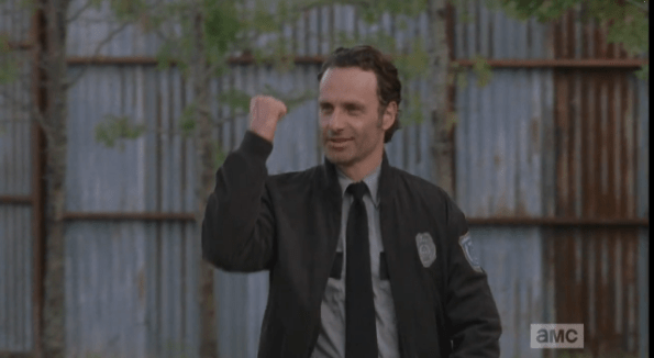 rick flashes his a stamp Published March 18, 2015 at 595 × 326 in The Walking Dead, Season 5, Episode 13, “Forget” …and Rick flashes his scarlet letter back to her. He watches McBeaty put a protective arm around his wife as they walk away…