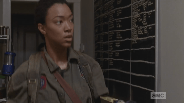 sasha checking our guns 1 Published March 13, 2015 at 592 × 331 in The Walking Dead, Season 5, Episode 13, “Forget” We see Sasha walking into the Alexandria Storeroom and Gun Lending Library, followed by Olivia, who’s like, “Oh, yeah, it’s cool that you came and woke me up before the dawn…I used to work in a coffee shop, so, you know, no problem.”