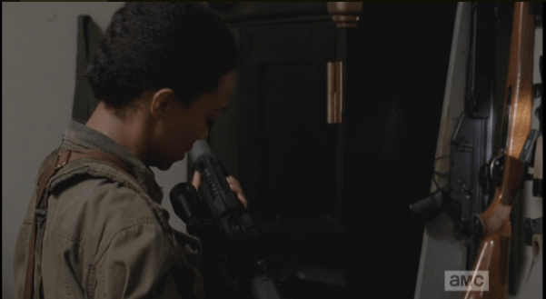 sasha checks over gun Published March 13, 2015 at 601 × 329 in The Walking Dead, Season 5, Episode 13, “Forget” As Sasha checks over her rifle, Olivia has a special request…