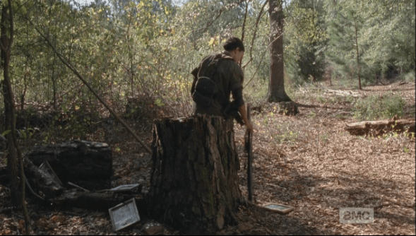 sasha end 2 Published March 13, 2015 at 589 × 334 in The Walking Dead, Season 5, Episode 13, “Forget” After all the pictures are gone, Sasha walks over to a large tree stump, sets her rifle beside her, and waits…