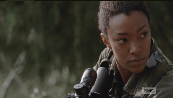 sasha looks around 1 Published March 13, 2015 at 593 × 335 in The Walking Dead, Season 5, Episode 13, “Forget” After the first frame goes down, Sasha looks around, seeing if anything, or anyone approaches, attracted by the sound of the gunfire. But all is quiet…