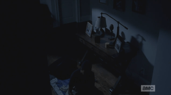 sasha sits up Published March 13, 2015 at 590 × 328 in The Walking Dead, Season 5, Episode 13, “Forget” Sasha’s had enough of trying to sleep surrounded by the captured frozen smiles of dead people in better times. She sits up, gets dressed.