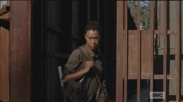 sasha walks thru gate Published March 13, 2015 at 592 × 331 in The Walking Dead, Season 5, Episode 13, “Forget” Sasha thanks the gate keeper as she walks out of Alexandria into the world outside the gates.