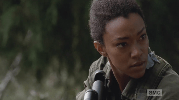 sasha watches and waits 2 Published March 13, 2015 at 589 × 330 in The Walking Dead, Season 5, Episode 13, “Forget” Sasha pauses, waits, nothing comes….