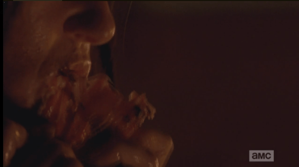 terminal mouths eating bob’s leg Published March 17, 2015 at 592 × 331 in The Walking Dead, Season 5, Episode 13, “Forget” And as the Alexandrian party guests nosh on the party spread, Sasha imagines the Terminans eating chunks of meat from Bob’s leg…