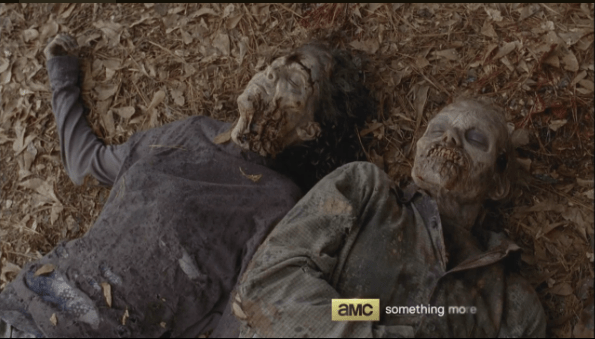 After the Bear McCreary opening title sequence and the McConaughey “not about huggin’ trees” car commercial, we see this opening shot of two walkers, both dropped by a bullet to the brain…Rick’s bullet, or Sasha’s? Sister didn’t look like picture frames was really gonna scratch that itch…she needed a little more.