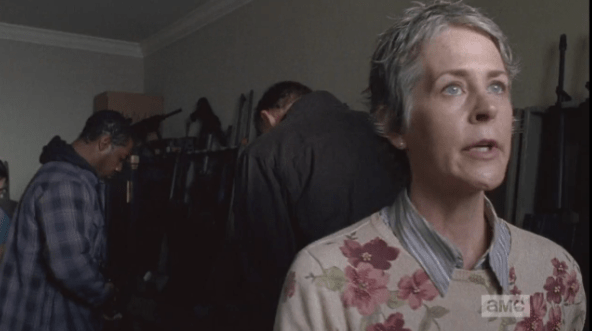 Carol helps herself to an entire bar of chocolate fro the freezer and then follows the others to the back. As she stands at the window, Tobin asks her if she’s afraid of guns…JL Carol delivers another riveting performance as she says that she carried a handgun while with the group, but knows nothing about the bigger guns, like the one Tobin is now holding.