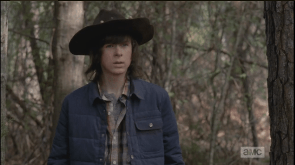 Carl peers around, looking for Enid, when he hears her voice call out, “Carl.” He looks around, does not see her. “I know you’re following me…again,” Enid’s voice continues. As Carl peers around, looking for her, Enid says, “And you’re going the wrong way.”