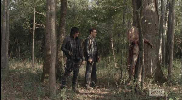 daryl and aaron discover the woman’s body 2 Published April 17, 2015 at 599 × 330 in The Walking Dead, Season 5, Episode 15, “Try …a woman’s body, lashed to a tree, naked, disembowled.