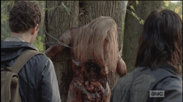 daryl and aaron look at the woman’s body 2 close up Published April 17, 2015 at 600 × 336 in The Walking Dead, Season 5, Episode 15, “Try The arms, and legs, and now this…it speaks of a sadistic cruelty and methodology being executed, as the woman was clearly stripped, lashed to a tree, helpless, and left for walkers to tear into.