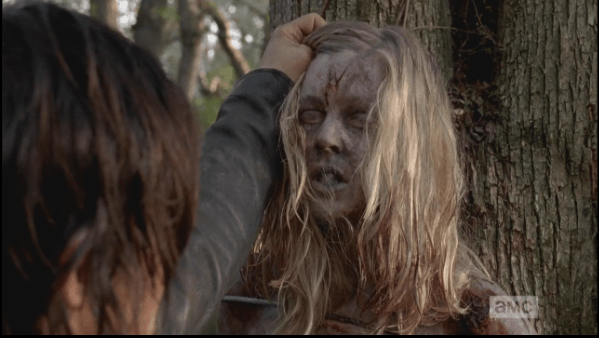daryl and aaron watch her reanimate 2 Published April 17, 2015 at 599 × 338 in The Walking Dead, Season 5, Episode 15, “Try As Daryl holds the young woman’s head up, her eyes flutter open as she reanimates.