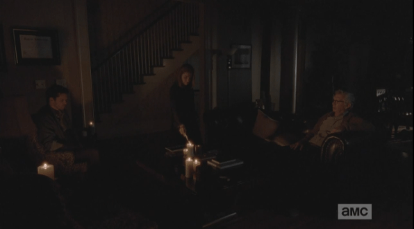 deanna lights note 1 Published April 6, 2015 at 596 × 331 in The Walking Dead, Season 5, Episode 15, “Try Deanna comes back into her living room with Carol’s sympathy note, and holds the note to the candle’s flame.