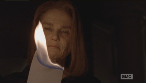 deanna lights note 5 deanna flame Published April 6, 2015 at 590 × 335 in The Walking Dead, Season 5, Episode 15, “Try Deanna, Reg, and Spencer watch the note burn in silence before Deanna drops it into a dish on the coffee table, where it burns and curls into ashes.