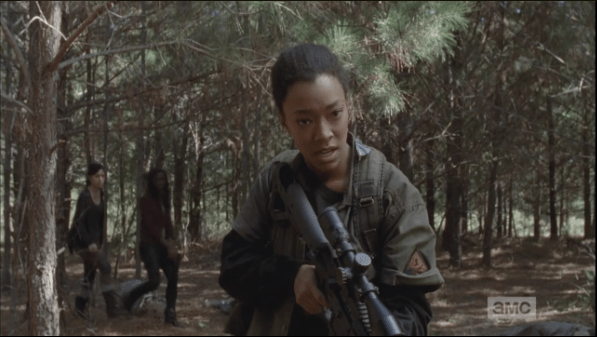 michonne and rosita come calling out sasha 1 Published April 16, 2015 at 597 × 337 in The Walking Dead, Season 5, Episode 15, “Try “Sasha,” Michonne calls. Sasha’s face registers her annoyance at being interfered with. “Go back,” she tells Michonne and Rosita, striding towards her next undead targets.