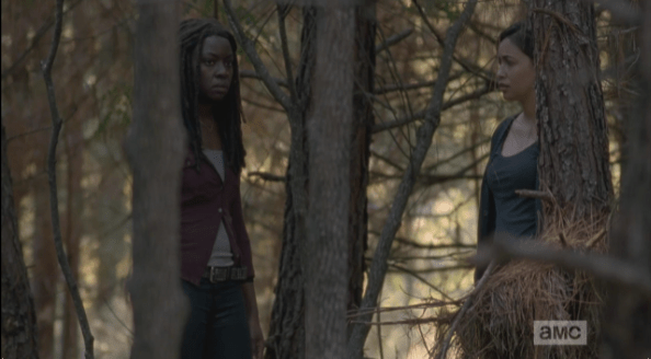 michonne faces rosita 2 Published April 8, 2015 at 594 × 328 in The Walking Dead, Season 5, Episode 15, “Try Michonne continues, “And I think…” She turns, then, as if trying to complete the unfinished thought in her head. After a brief pause, she shakes her head, resumes walking. “Just feel like I was asleep in there.”