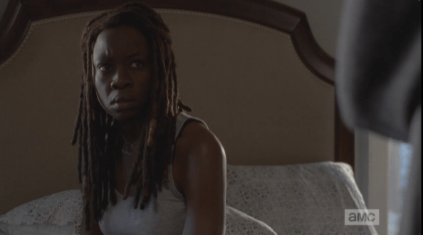 michonne looks at rosita Published April 8, 2015 at 594 × 330 in The Walking Dead, Season 5, Episode 15, “Try Michonne looks at Rosita, quick to grasp the gravity of that statement. “Is she still up there?” she asks.