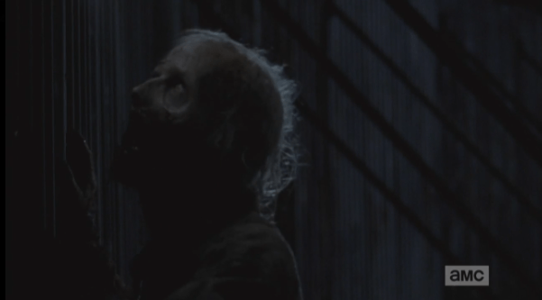 night walker at the gates trying to get in Published April 6, 2015 at 601 × 333 in The Walking Dead, Season 5, Episode 15, “Try Meanwhile, You Got A Little Something On Your Face There, Walker has reached the Alexandrian walls and paws at the gates, snarling and trying to get in.