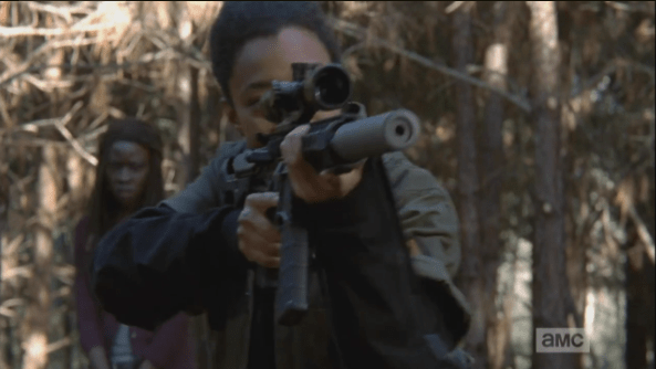 sasha aims at group of walkers Published April 16, 2015 at 593 × 334 in The Walking Dead, Season 5, Episode 15, “Try Sasha lifts her rifle and peers through the scope as Michonne looks on dubiously…