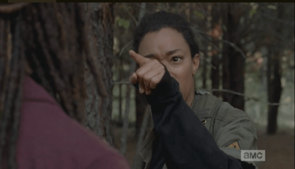 sasha points at michonne Published April 17, 2015 at 592 × 339 in The Walking Dead, Season 5, Episode 15, “Try When in doubt, blame the big sister…Sasha glares at Michonne. “You,” she begins…