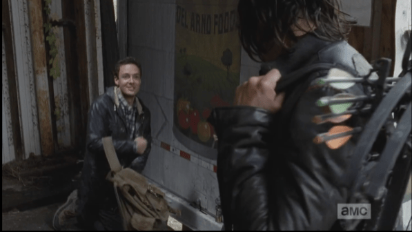 aaron is stoked Published April 28, 2015 at 597 × 336 in The Walking Dead, Season 5, Episode 16, “Conquer” “Whoa!” Aaron exclaims, looking delighted. “I never thought I’d see one of these!” Yep, too good to be true…