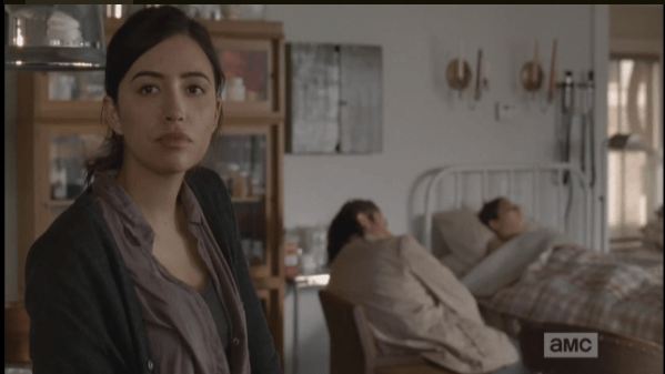 abraham visits tara 2 Published May 24, 2015 at 599 × 337 in The Walking Dead, Season 5, Episode 16, “Conquer” …and stops short when he sees Eugene’s dozing form, slumped in one of the visitor’s chairs beside Tara’s bed.