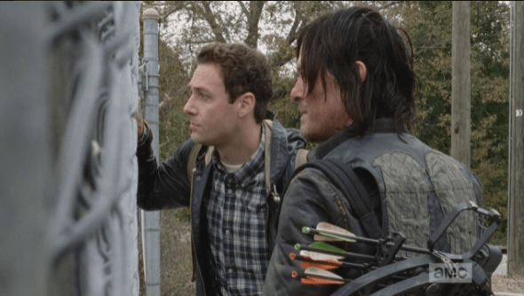 daryl and aaron fence 3 Published April 28, 2015 at 590 × 334 in The Walking Dead, Season 5, Episode 16, “Conquer” Daryl points out that if they do this now, it means they’ve given up on finding the man with the red jacket. Aaron replies that home is 50 miles that way…it’s time to go.