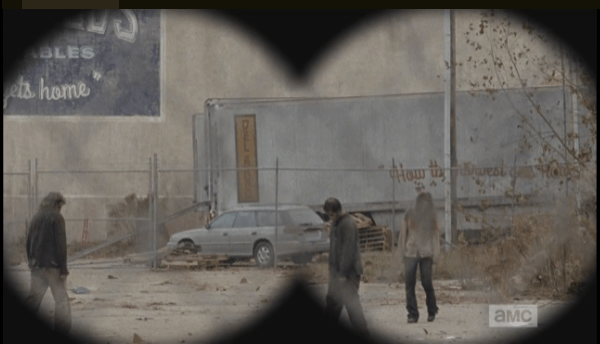 daryl and aaron see fences, trucks Published April 28, 2015 at 600 × 344 in The Walking Dead, Season 5, Episode 16, “Conquer” Peering through binoculars, Daryl and Aaron spot a couple of tractor trailers which look promising for a major food score.