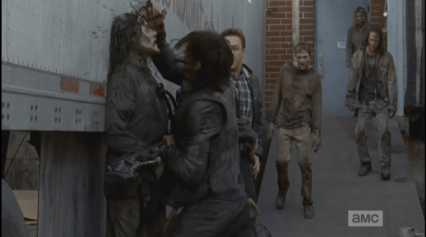 daryl stabs aaron walker Published April 28, 2015 at 597 × 333 in The Walking Dead, Season 5, Episode 16, “Conquer” Daryl then spears his knife into a walker that has come up on Aaron. Aaron must be taking notes, because he machetes two walkers upside the head as they run for cover…
