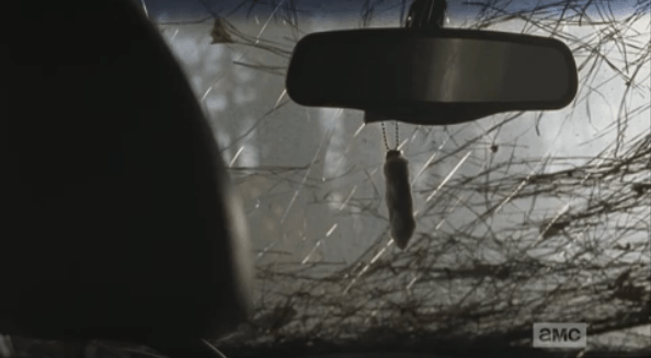 …as he looks up and sees his lucky rabbit’s foot has kept him safe again. I am assuming that this rabbit’s foot belonged to Morgan’s son, Duane, who was bitten by the walker his mother became after dying from a walker bite and ensuing fever. I imagined, watching this scene, that Morgan started every day by taking a moment to remember his son. The rabbit’s foot was an item that he lay on the altar back at Gabriel’s church, right before finding the map to D.C. with Abraham’s note to Rick written on it, as he knelt in prayer at the altar.
