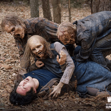 glenn and three walkers Published May 24, 2015 at 390 × 391 in The Walking Dead, Season 5, Episode 16, “Conquer” Aye, aye, aye! Watching this finale episode, my WD buddy and I were super freaked at this scene, and then the shot faded out to commercial. I turned to my WD buddy and said, “They’re not going to take Glenn down with a fade-out!”
