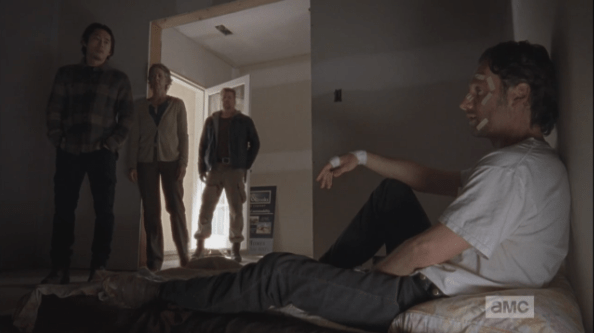 glenn, carol, abraham walk into the room Published April 27, 2015 at 594 × 333 in The Walking Dead, Season 5, Episode 16, “Conquer” As Glenn, Carol, and Abraham stand, watching, we hear Michonne’s voice ask Rick, “Where’d you get the gun?”
