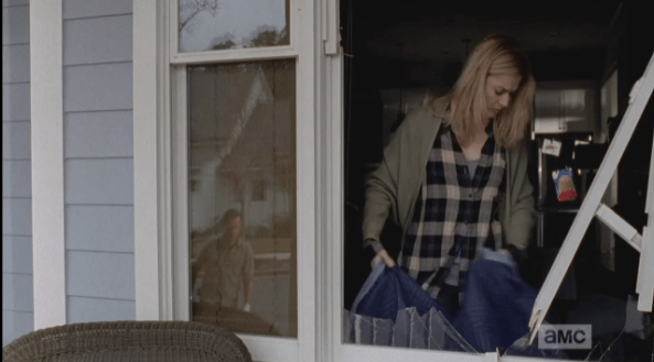 jessie cleaning up Published April 28, 2015 at 593 × 329 in The Walking Dead, Season 5, Episode 16, “Conquer” As Jessie tries to clean up the broken mess of her living room window, we see a gentleman caller has come to pay a visit…