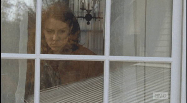 maggie watches gabriel out the window Published April 27, 2015 at 600 × 330 in The Walking Dead, Season 5, Episode 16, “Conquer” Looking out a window, Maggie watches Gabriel take his priest’s frock off the clothesline.