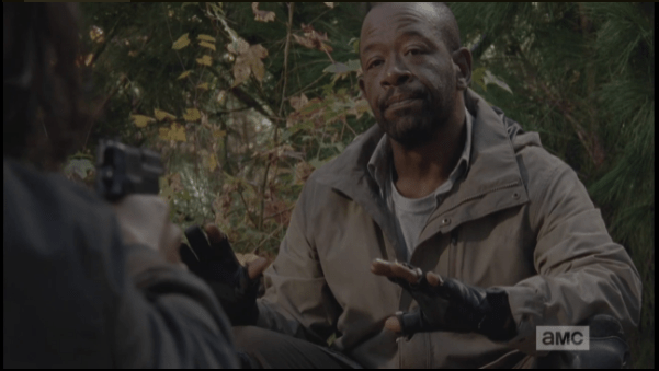 morgan raises his hands Published April 24, 2015 at 601 × 339 in The Walking Dead, Season 5, Episode 16, “Conquer” Morgan turns back towards the young man, his hands raised in a gesture of surrender.