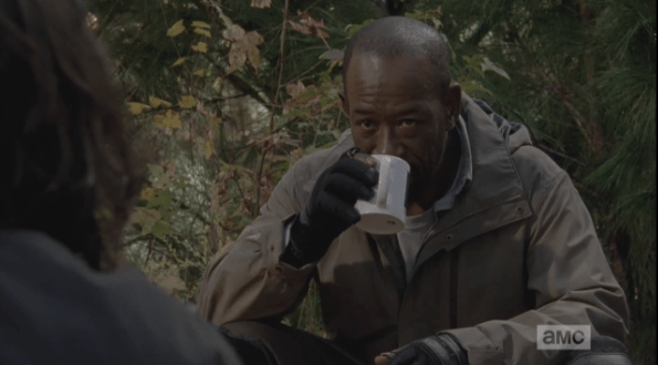 morgan tries to take a drink of soup Published April 24, 2015 at 595 × 330 in The Walking Dead, Season 5, Episode 16, “Conquer” Morgan’s hand pauses, the mug stops mid-sip. He lowers the mug. “Why?” he asks the young man, hand turned up in question.